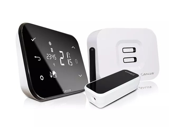 | SALUS iT 500 - termostat ovládaný cez internet prostredníctvom počítača alebo mobilu - ovláda vaše vykurovanie a teplú vodu cez internet - termostat je kompatibilný s počítačom alebo inteligentným telefónom (smartphonom) - Váš počítač a telefón sú pripojené k systému existujúceho širokopásmového pripojenia (routera) - stabilná interná bezdrôtová komunikácia je zabezpečená bezdrôtovým prenosom na frekvencii 868MHz - interný bezdrôtový systém umožňuje jednoduchú inštaláciu termostatu na vhodne zvolené miesto - ide o veľmi energeticky úsporný a bezpečný systém Hmotnosť 0.438 kg Napájanie termostatu : 2 x AA alkalické batérie Napájanie prijímača : 230V AC 50Hz Napájanie internetovej brány: 5V DC Maximálna odporová záťaž : CH1: 16(5)A CH2: 5(3)A Spínanie : 2x beznapäťový kontakt NO/COM/NC Rozsah riadenia teploty : 5-35°C Citlivosť teploty: 0,5°C Hysterézia : ±0,5°C Prijímač : iT500RX (nie je možné kúpiť samostatne) Signál RF : 868 MHz Rozmery termostatu [mm] 128 x 95 x 35 Rozmery prijímača [mm] 150 x 100 x 35 Rozmery internetovej brány [mm] 39 x 91 x 25 anténa: 70 cena: 229.00 € (6898.85 Sk)